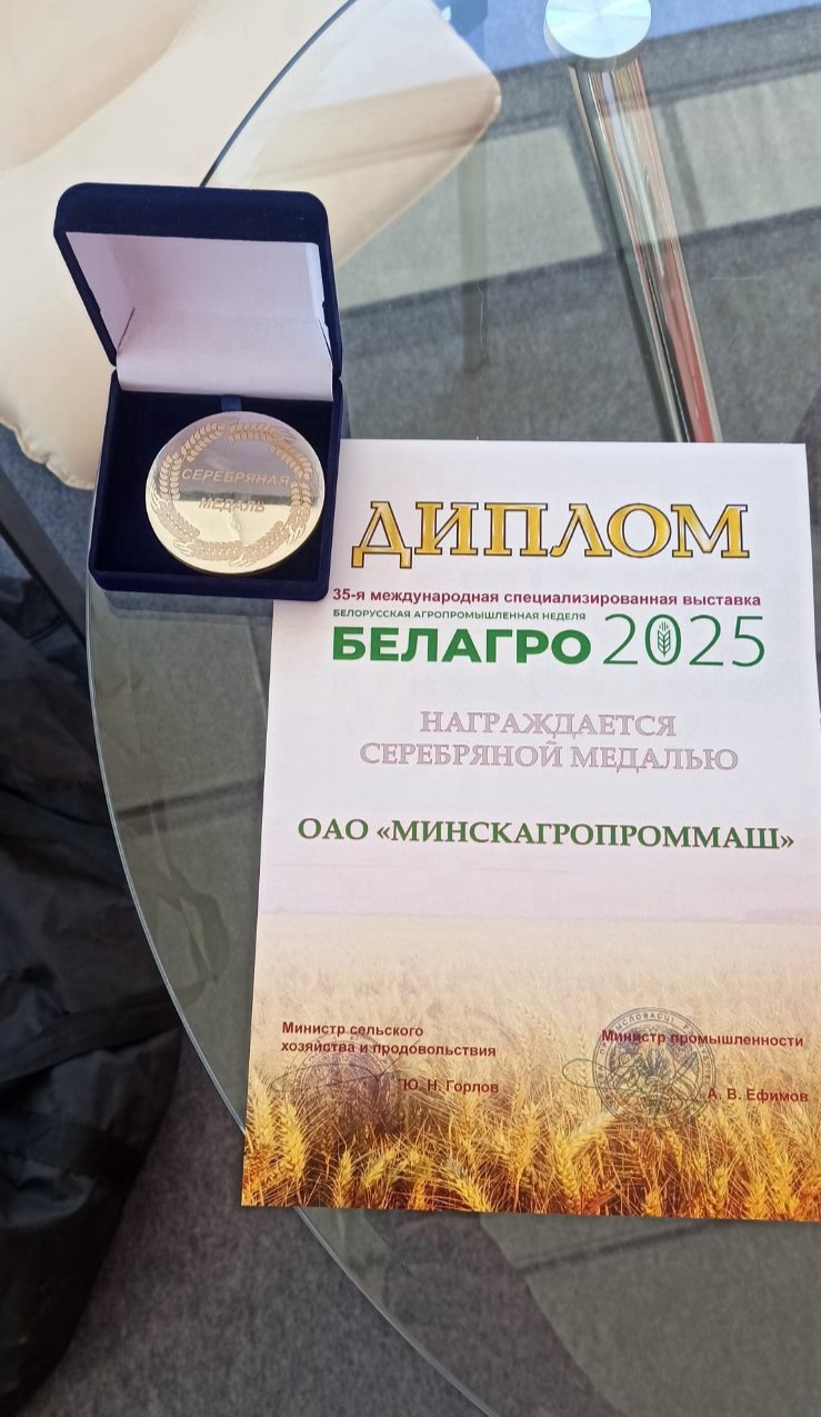Завершилась юбилейная 35-я выставка БЕЛАГРО-2025 торжественной церемонией награждения участников, на которой ОАО "ЗАВОД МИНСКАГРОПРОММАШ" было отмечено серебряной медалью.